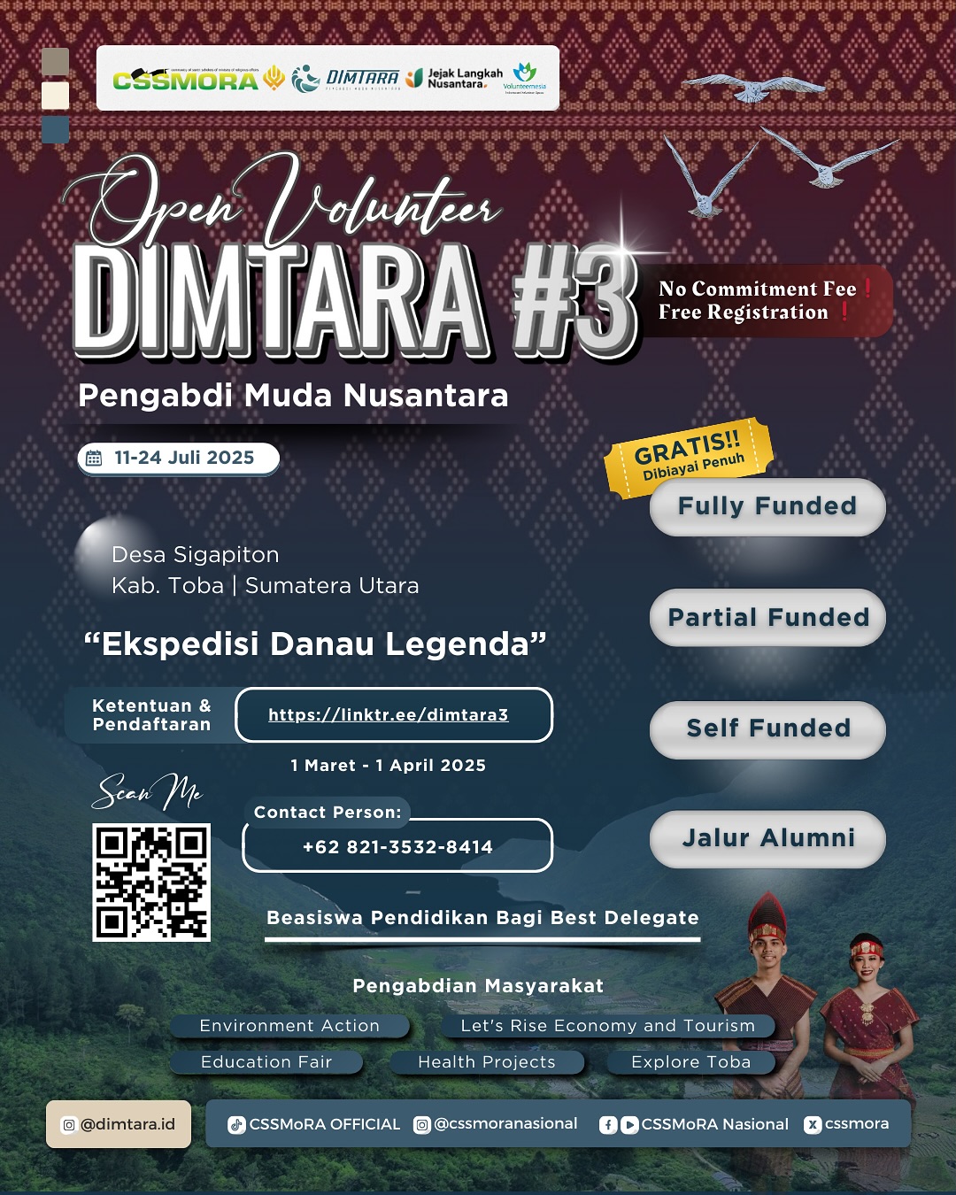 Kegiatan CSSMoRA Kembali Mengukir Jejak: DIMTARA 3 Hadir di Toba, Kolaborasi Bersama Jejak Langkah Nusantara untuk Negeri Dari Rahim Pesantren, Untuk Indonesia Tercinta. CSSMoRA (Community of Santri Scholars of Ministry of Religious Affairs) dengan bangga mengumumkan kelanjutan program pengabdian unggulan kami, DIMTARA 2 March, 2025 No Comments